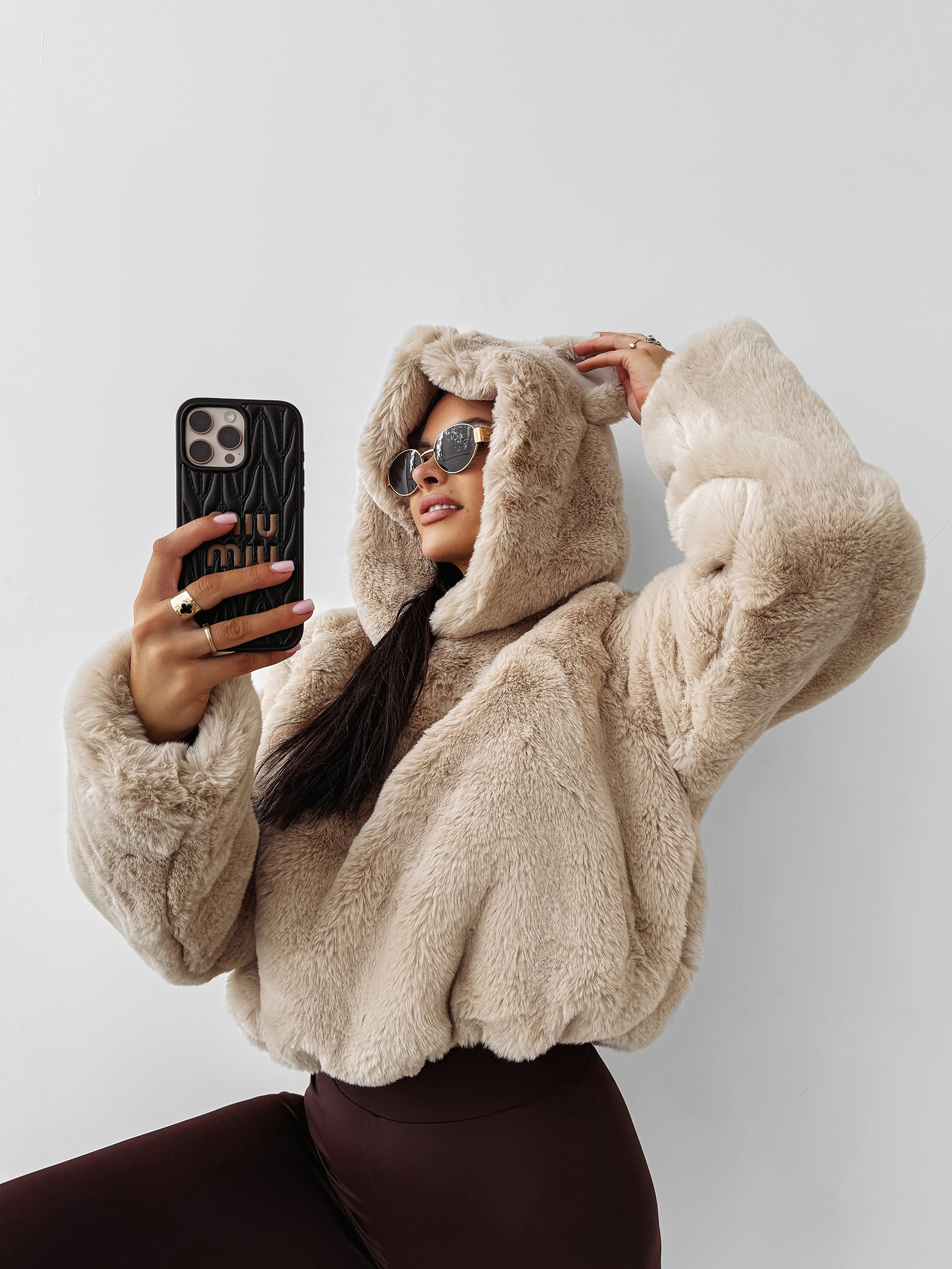 Modny oversize’owy krój z efektownym kapturem zakończonym uroczymi uszkami