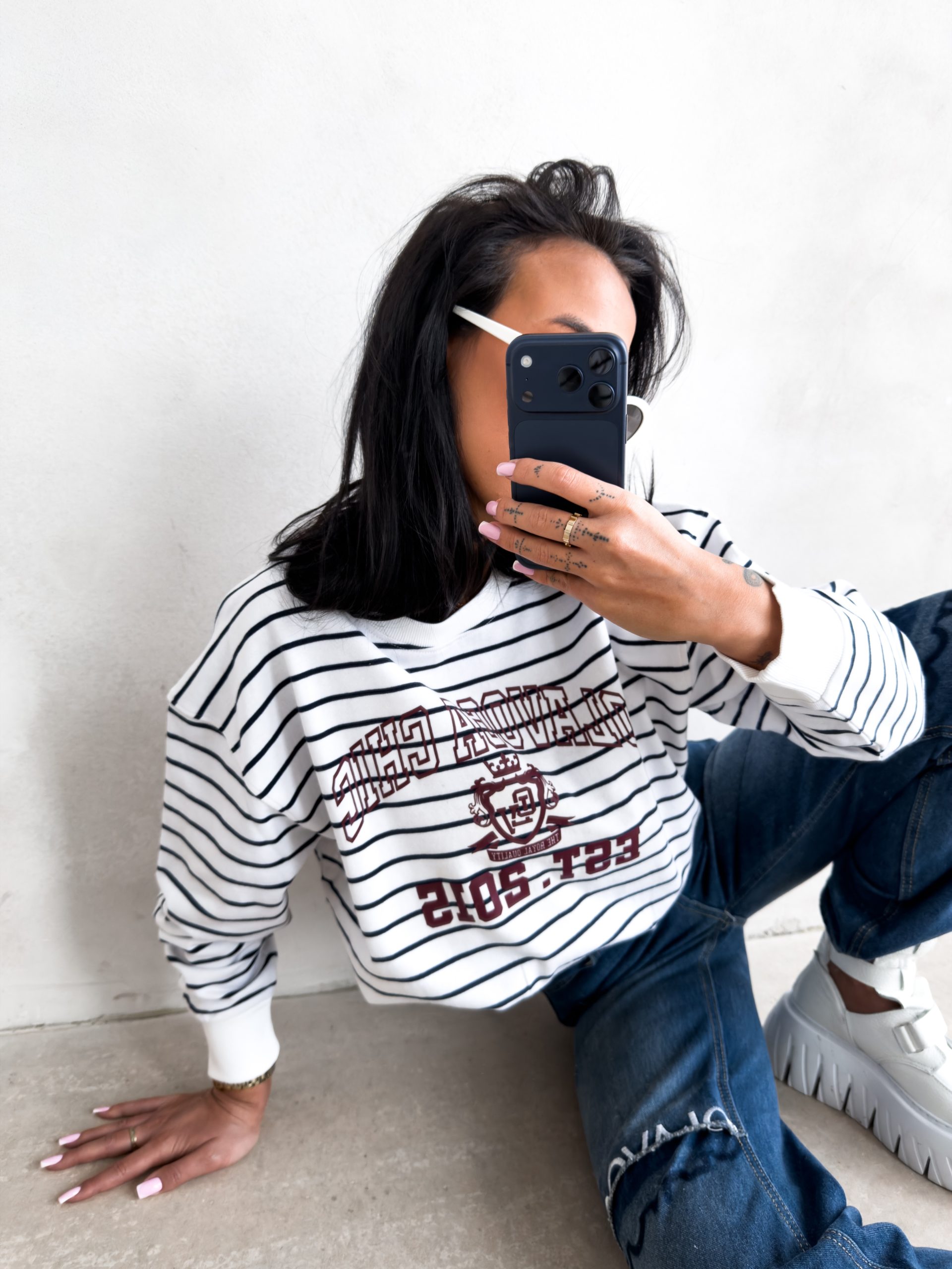 Bluza o casualowym, sportowym charakterze, wykonana z miękkiej, przyjemnej w dotyku dzianiny o delikatnej strukturze. Model w klasyczne, poziome pasy. Swobodny krój z okrągłym dekoltem oraz obniżoną linią ramion. Długie rękawy oraz dół wykończone elastycznymi ściągaczami. Na przodzie efektowny, kontrastowy nadruk z logo marki OLAVOGA CHIC oraz hasłem „THE ROYAL QUALITY” i „EST. 2015”.