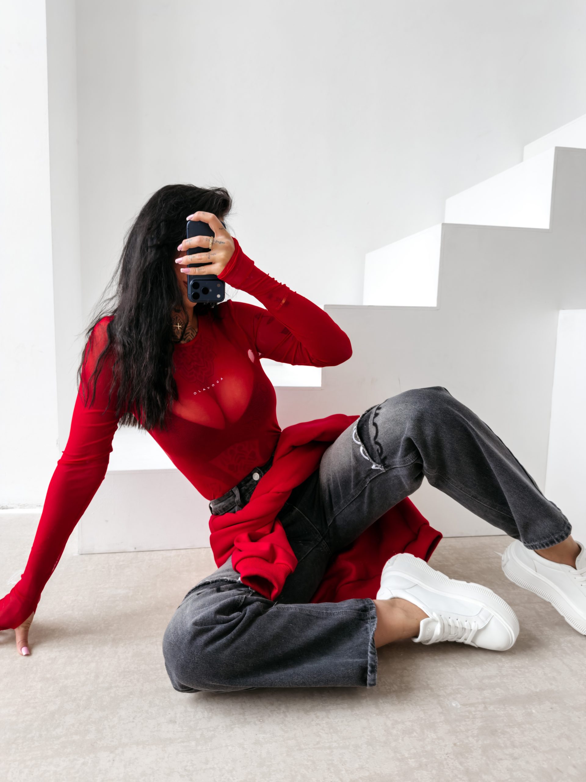Dopasowane body wykonane z elastycznej, półtransparentnej siateczki o delikatnej, gładkiej strukturze. Model z długim rękawem oraz klasycznym, zaokrąglonym dekoltem. Na przodzie subtelne logo marki OLAVOGA. Tył z efektownym, owalnym wycięciem. Rękawy wykończone otworem na kciuk.
