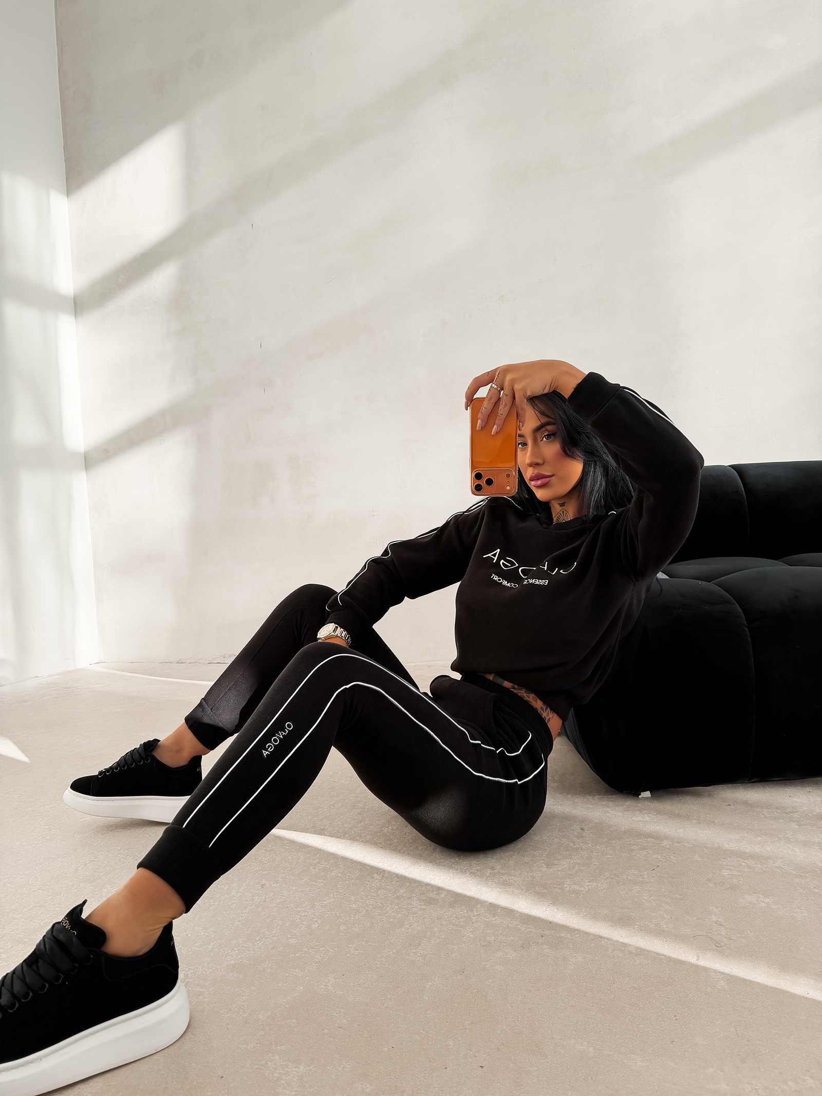 Bluza o klasycznym kroju z okrągłym dekoltem zapewnia swobodę ruchów oraz łatwość stylizacji. Elastyczne ściągacze przy rękawach stabilizują fason, a tłoczony haft z logo OLAVOGA i hasłem „ESSENCE OF COMFORT” podkreśla filozofię marki opartą na wygodzie. Kontrastowe lampasy wzdłuż rękawów dodają subtelnego urozmaicenia wizualnego.